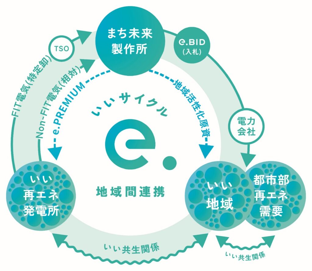 e.CYCLEは、地域貢献を求める再エネ発電所の電力を買い取り、小売電気事業者への卸販売を通じて、再エネの地産地消や都市間流通を促す国内唯一のモデルです。再エネ電力を卸販売する小売電気事業者を「エネオク」を活用して選定することで、需要家にとって適正な価格で再エネ電力の提供を行うものです。