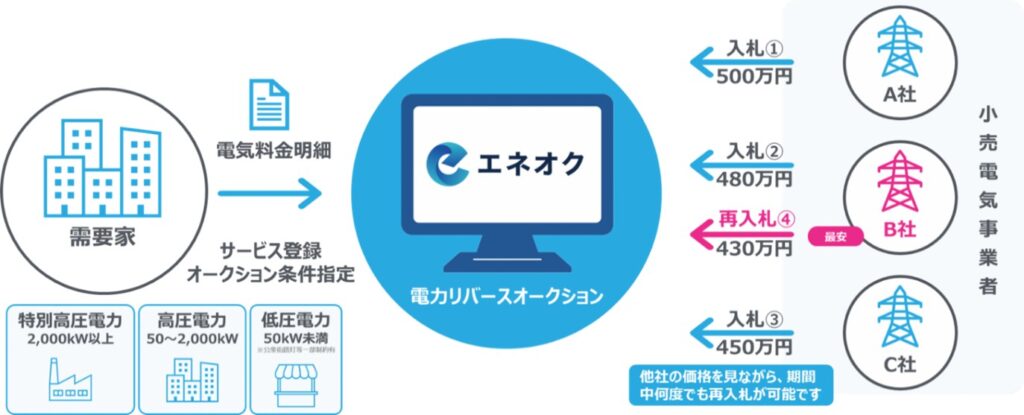 エネオクは、小売電気事業者が他社の入札価格が見える状態で、一定期間何度でも再入札が可能な競り下げ方式によるオークションを通じて需要家と小売電気事業者をマッチングするサービスです。