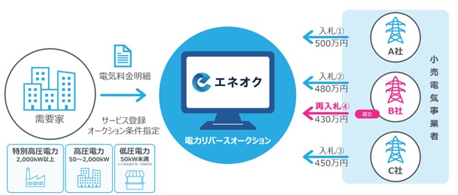電力契約の切替先選定手法としてリバースオークション方式※を採用した需要家の電気料金最適化を支援する国内唯一の無料サービスです。