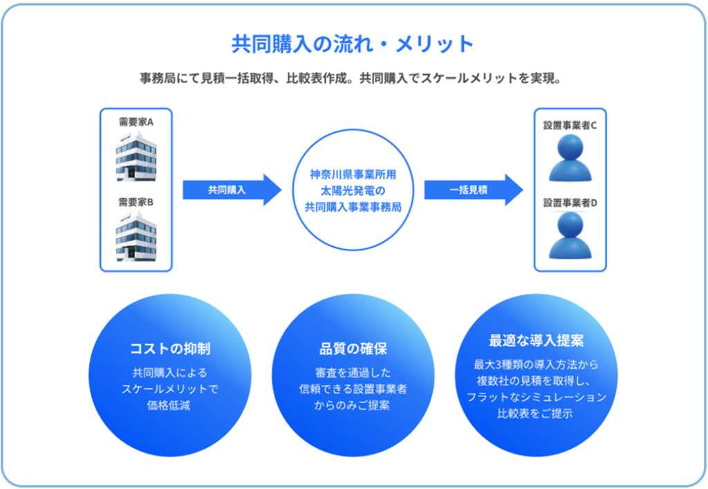 本事業は、共同調達によるスケールメリットを活かした価格低減を促すことで、さいたま市内の事業所に太陽光発電設備の導入を希望する事業者が、通常よりも安価に太陽光発電設備を導入できることを目指すものです。