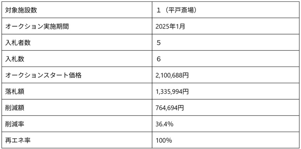 今回、公共施設1施設をモデルとして再エネ条件付きのリバースオークションを行った結果、計5社から6件の入札があり、再エネ化だけでなくコスト削減も実現することができました。