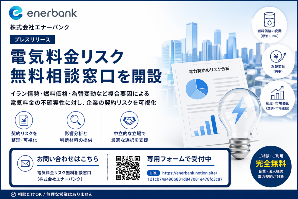 株式会社エナーバンク(以下、当社)は、イラン情勢をはじめとする国際的なエネルギー環境の変化を背景に、企業の電力コスト上昇リスクへの対応を支援するため、「電気料金リスク無料相談窓口」を開設しました。